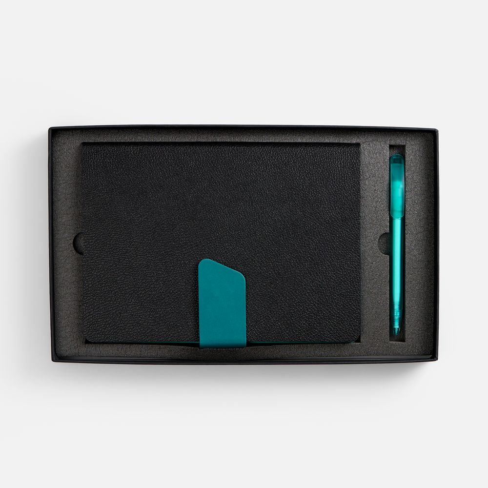 Грамотное планирование времени и рациональное распределение усилий являются залогом успеха в любом деле. А в бизнесе к этому списку добавляется внимание к деталям. Набор Boom, черный с бирюзовым (артикул 01-20780.30) — отличный бизнес-подарок для делового человека, который можно еще и превратить в промопродукцию с помощью шелкографии, печати или тиснения. За счет этого удастся сделать бренд более узнаваемым. На таких канцелярских принадлежностях хватит места для корпоративной символики, которая постоянно на виду.