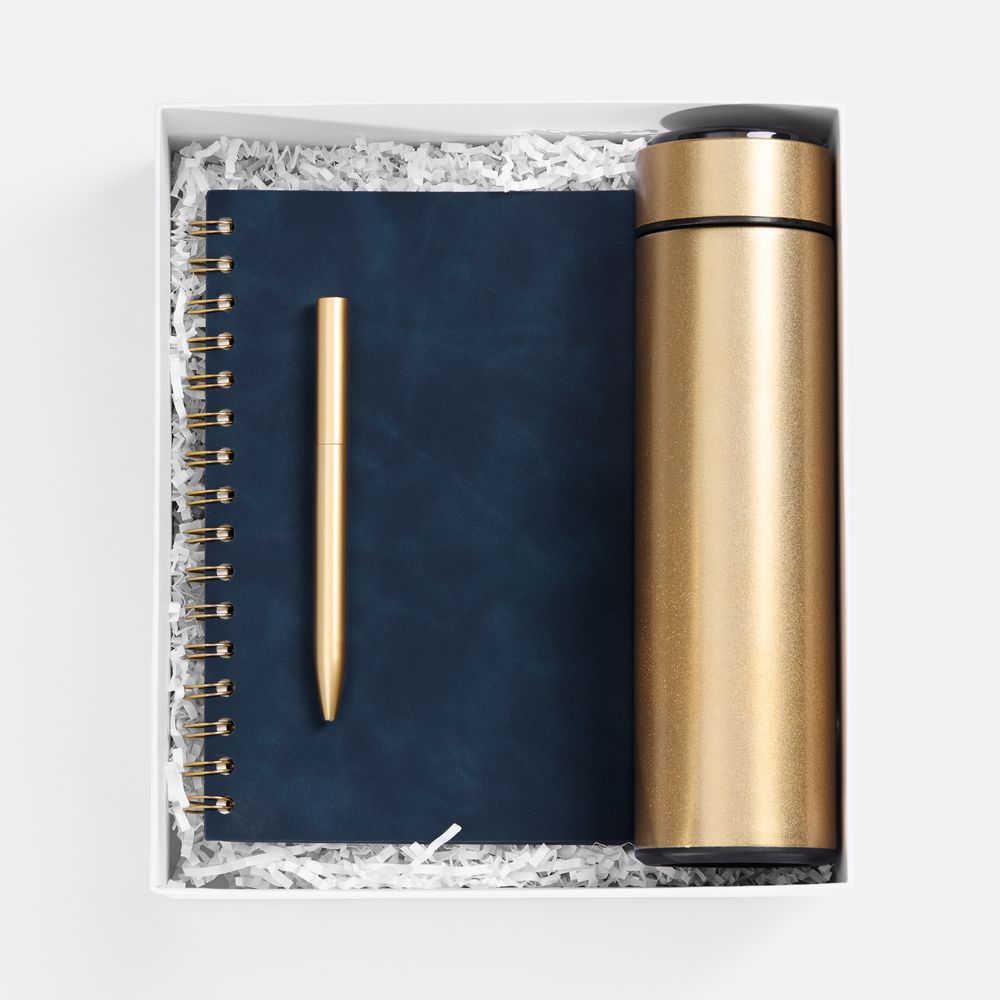 Грамотное планирование времени и рациональное распределение усилий являются залогом успеха в любом деле. А в бизнесе к этому списку добавляется внимание к деталям. Набор Spiral Gold, синий (артикул 01-21398.40) — отличный бизнес-подарок для делового человека, который можно еще и превратить в промопродукцию с помощью шелкографии, печати или тиснения. За счет этого удастся сделать бренд более узнаваемым. На таких канцелярских принадлежностях хватит места для корпоративной символики, которая постоянно на виду.